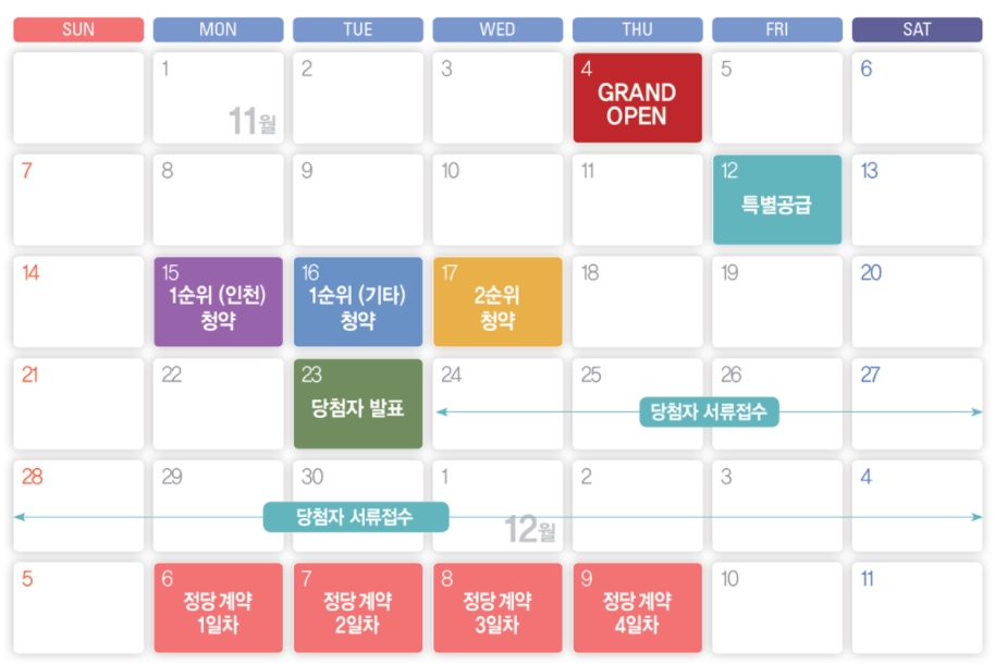 - 11.12일 특별공급, 11.15일 1순위(인천) 청약, 11.16일 1순위(기타), 11.17일 2순위 청약