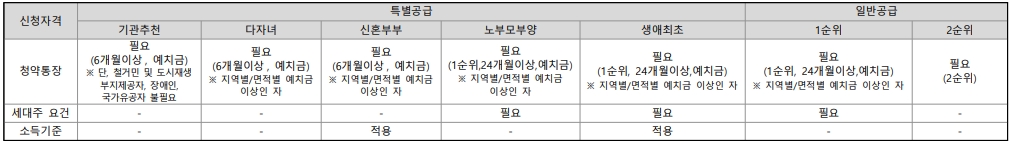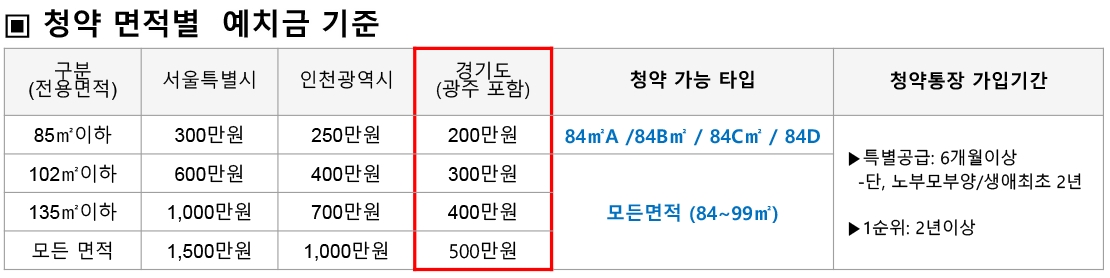 공 통 | 최초 입주자 모집공고일(21.11.04일) 현재 ㅇ 광주시 거주하거나 수도권(서울시,경기도)에 거주하는 만19세이상인자 ㅇ 세대주일것, 세대주인 미성년자(자녀양육,형제자매부양) ㅇ 청약통장에 가입하여 2년이 지난자 로서 예치기준 금액 이상 납인한자 |