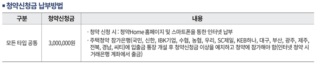 ㅇ 청약신청금 : 모든 타입 공통 300만 원, 주택청약 참가은행에 청약 시에 청약신청금 이상을 예치해놔야 합니다.