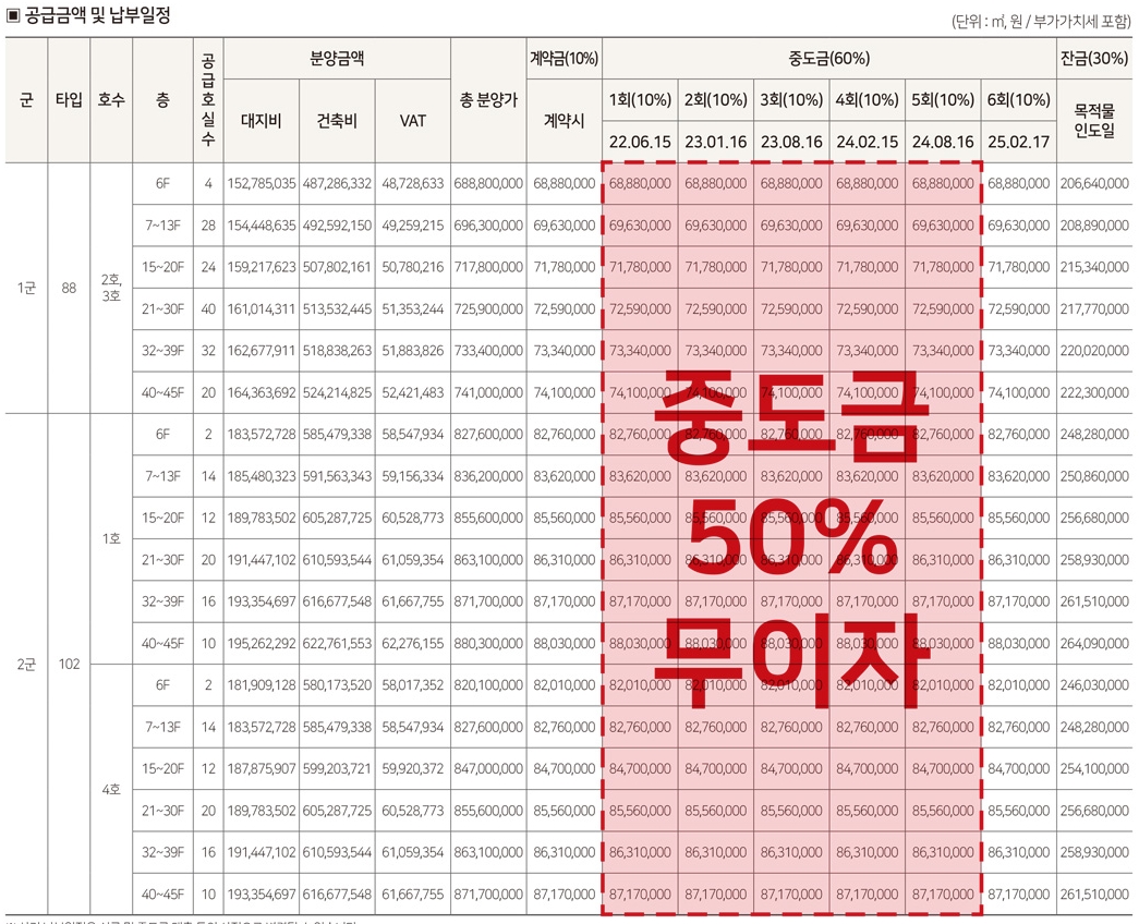 ㅇ 중도금 50% 무이자 가능, 계약금 10%와 중도금 10% 자납 필요.