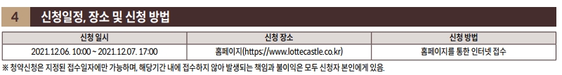 ㅇ 순위 구분 없음 : 21.12.06(월) 10:00~12.07(화) 17:00(롯데캐슬 홈페이지 인터넷 청약)