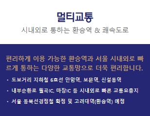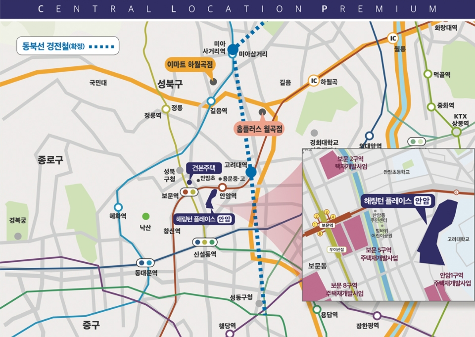ㅇ 교통 호제 : 도보 가능 지하철 6호선 암암역/보문역/신설동역, 동북선 경전철 확정, 고려대역(예정), 내부순환로 등