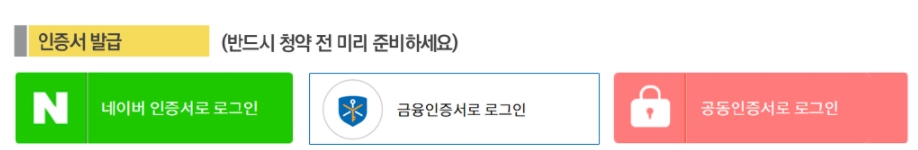 ㅇ 청약 전 필수 준비 : 인증서 발급 3가지 중 하나(네이버 인증서, 금융인증서, 공동 인증서)