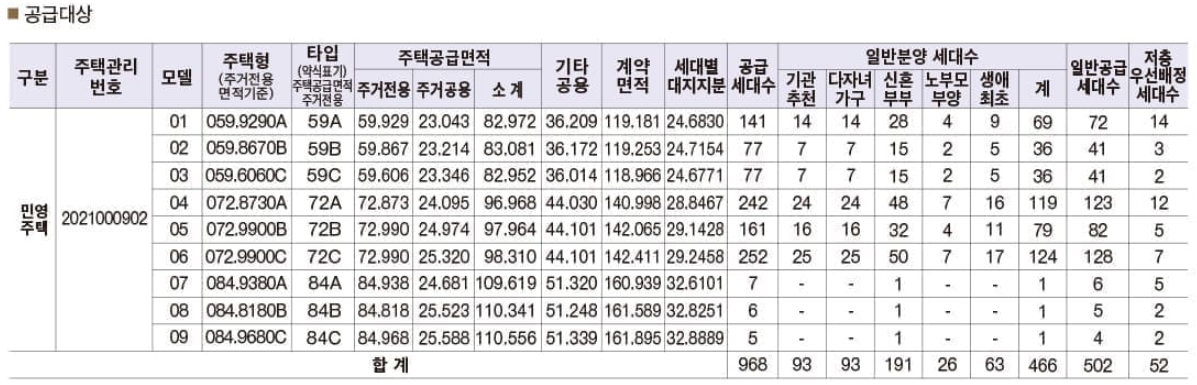 ㅇ 공급세대수 : 아파트 총 1909세대 중 일반분양 968세대