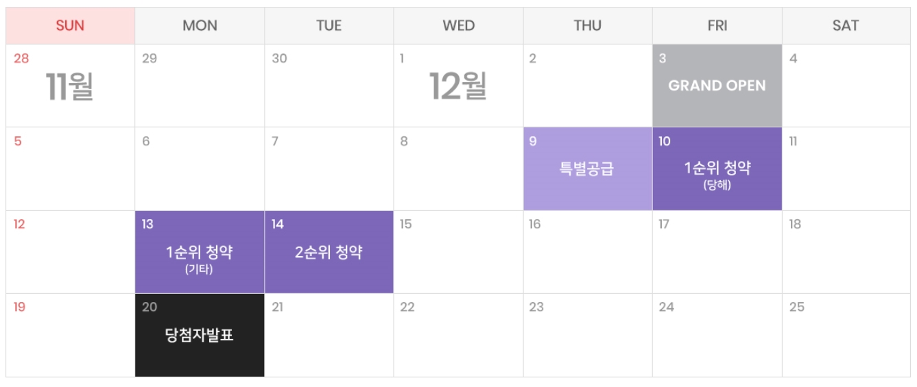- 12.09일 특별공급, 12.10일 1순위(해당), 12.13일 1순위(기타), 12.14일 2순위 청약
