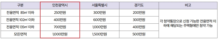 공 통 | ㅇ 인천에 거주하거나 수도권(서울시,경기도)에 거주하는 만19세이상인자 ㅇ 세대주, 세대주인 미성년자(자녀양육,형제자매부양) ㅇ 청약통장에 가입하여 2년이 지난자로서 예치기준금액 이상 납인한자 |