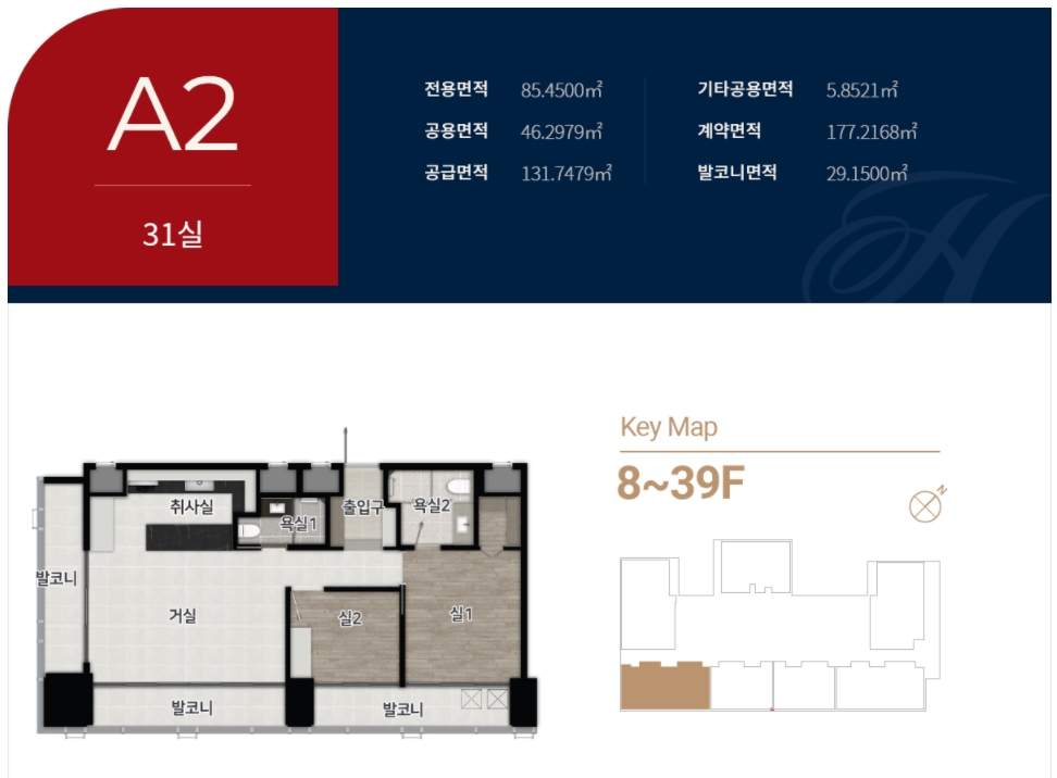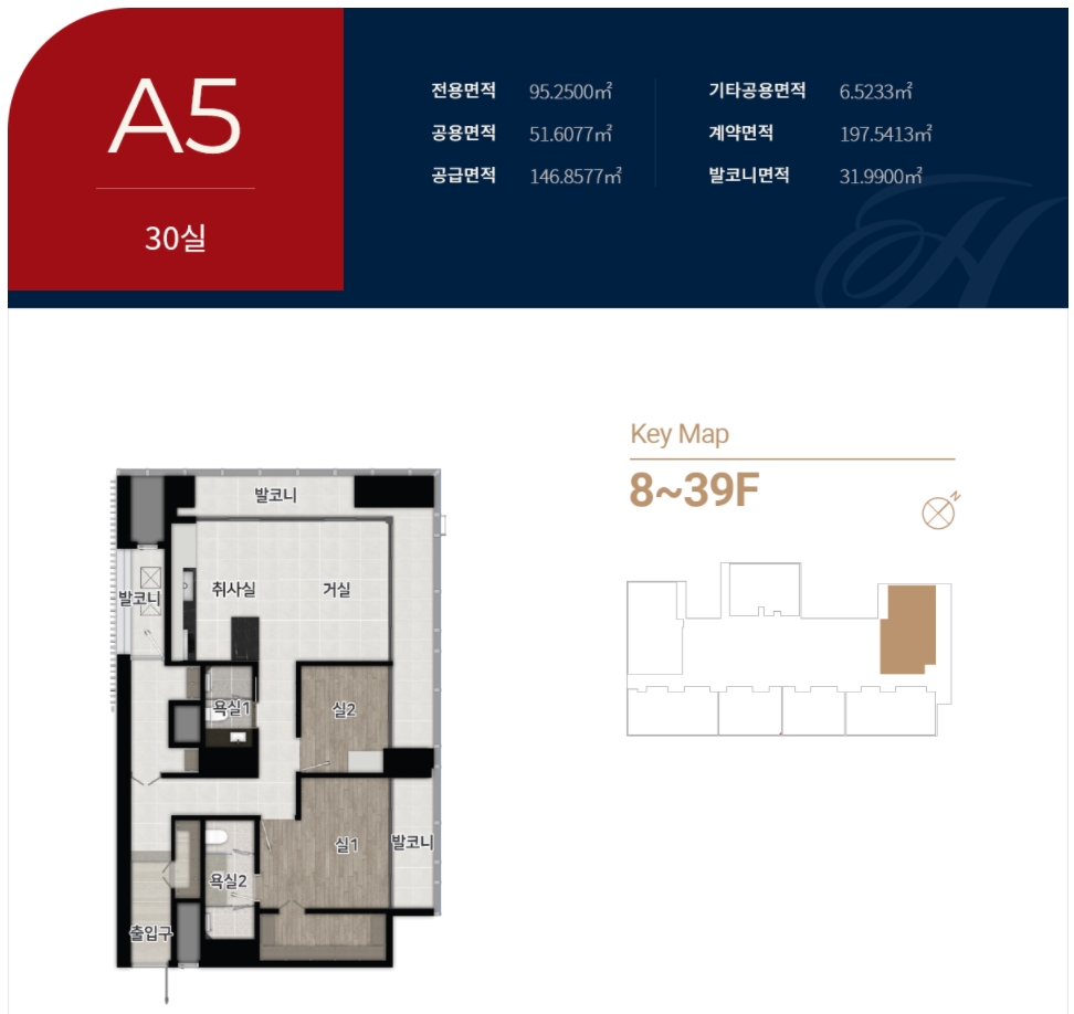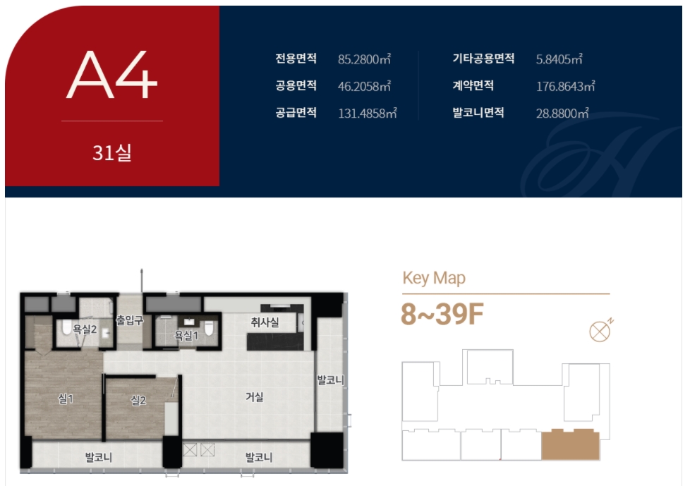 - 1군 : A1 34실, A2 31실, A3 62실, A4 31실, A5 30실 / 총 188세대