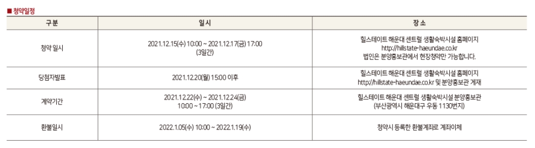 ㅇ 청약신청 : 12.15~17일(10시~17시)힐스테이트 해운대 센트럴 홈페이지(http://hillstate-haeundae.co.kr/)내 청약신청